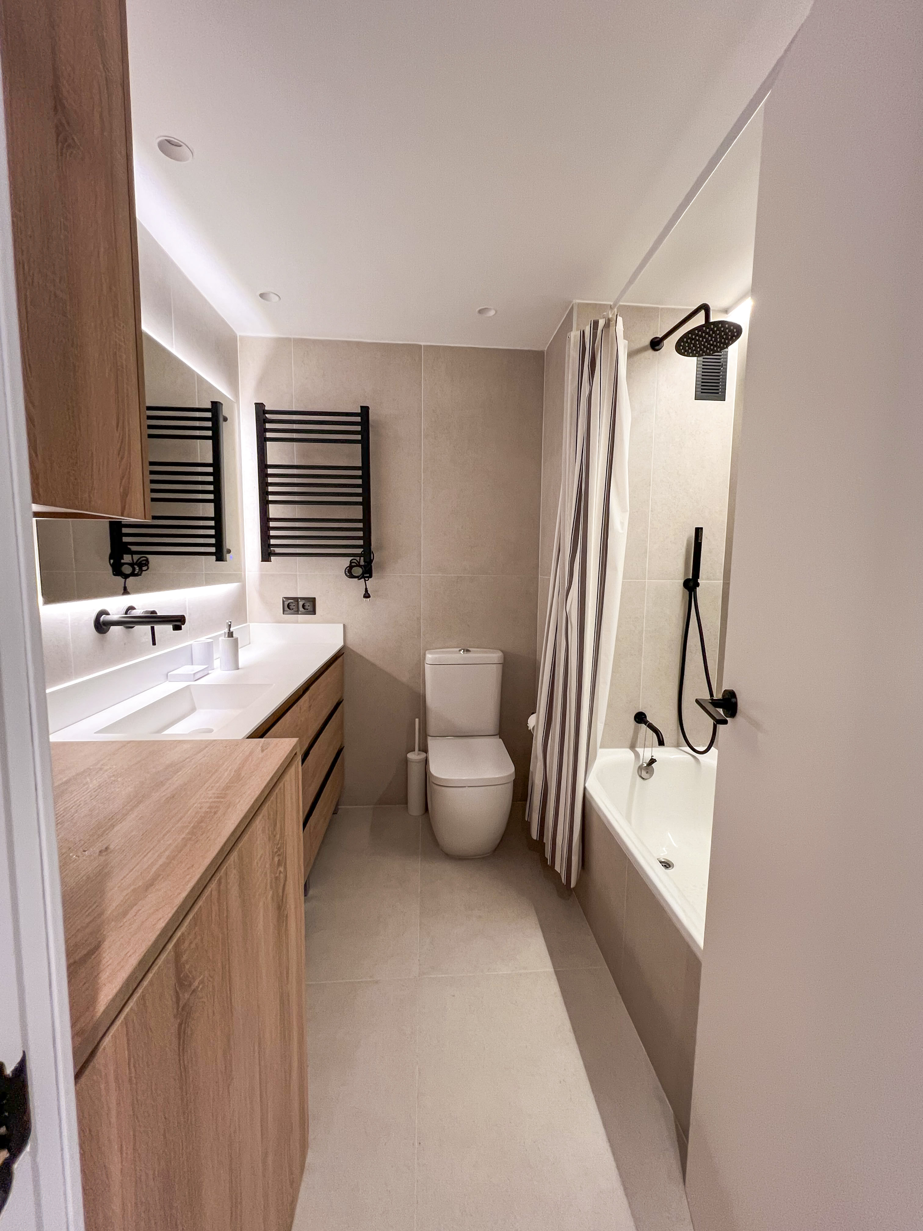 El apartamento donde está original tenía dos dormitorios, dos baños, cocina y salón comedor, la intervención consistió en conseguir un dormitorio más y hacer cocina americana en el salón, además de la actualización de los baños.