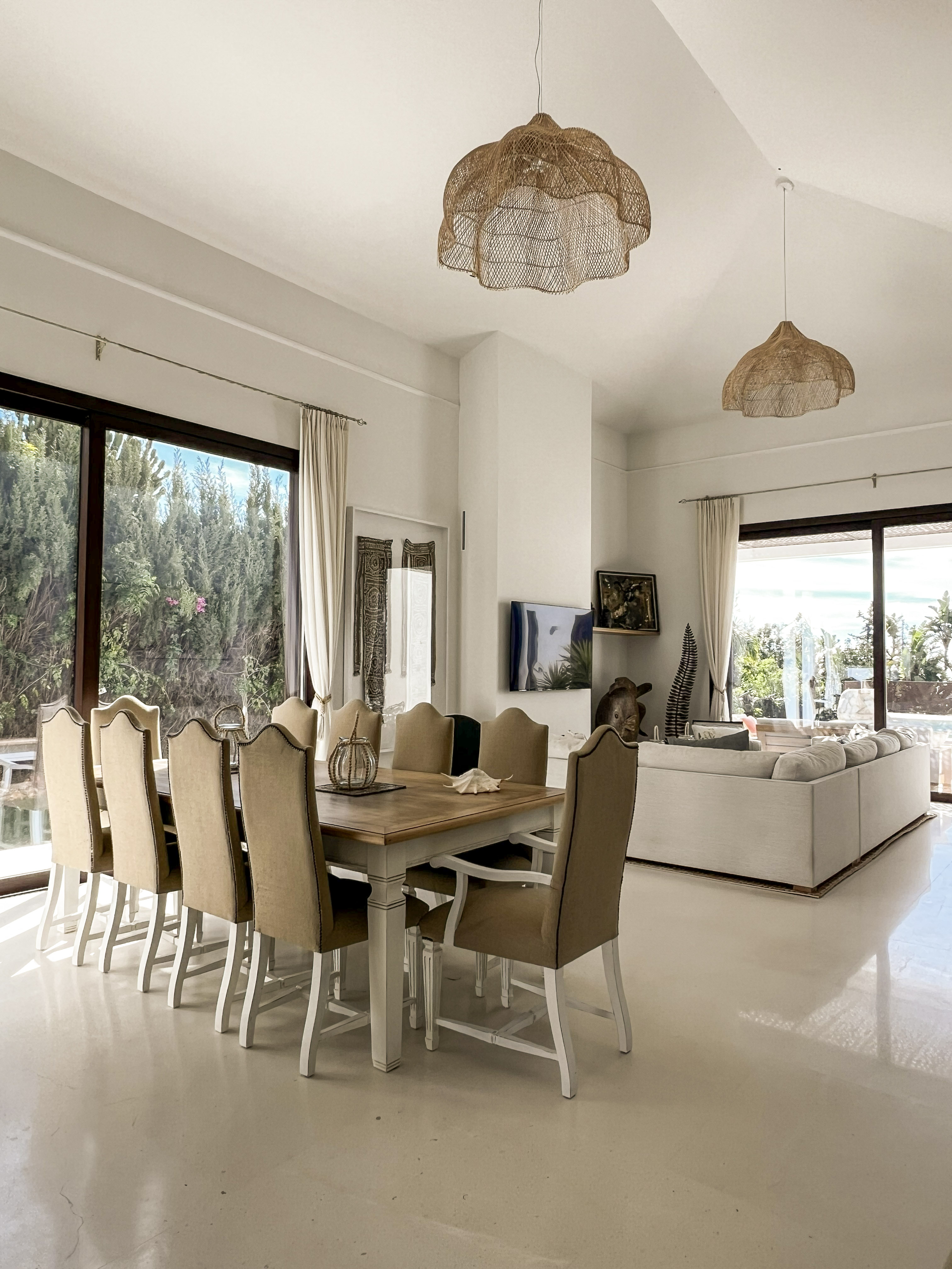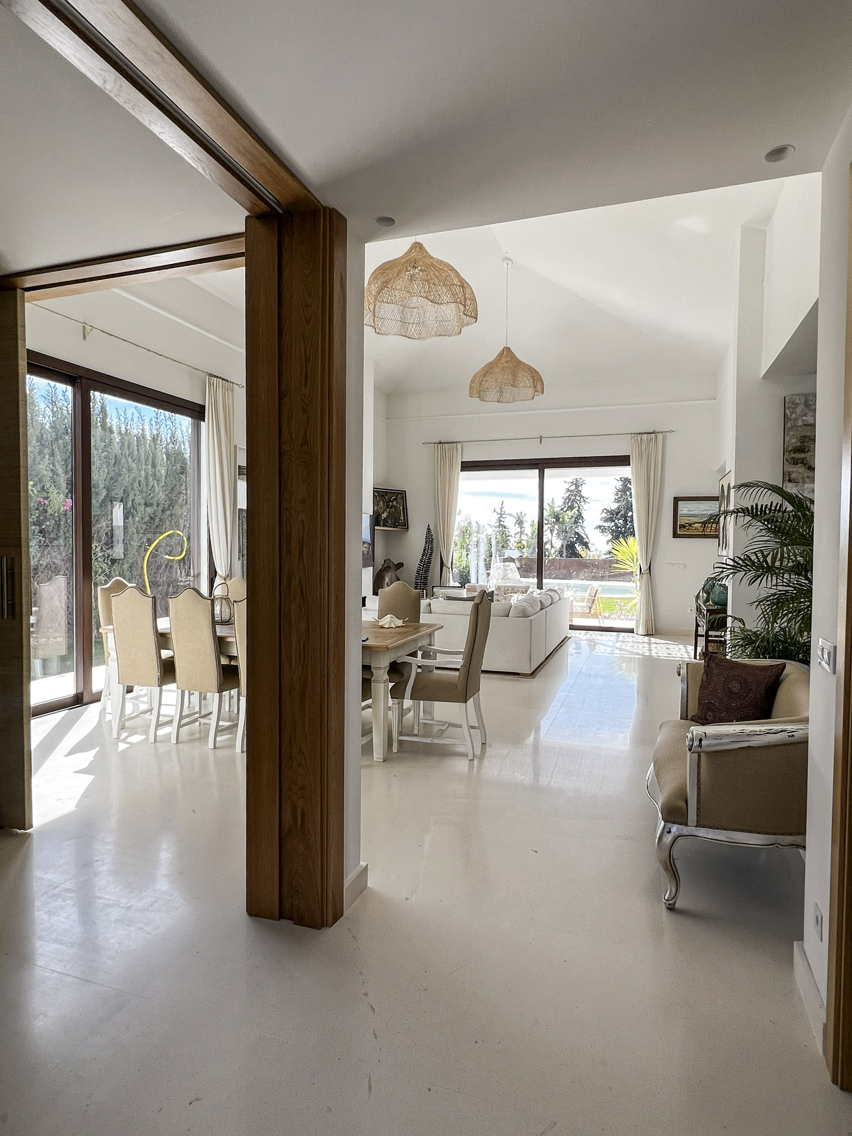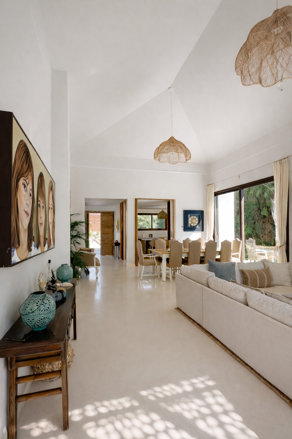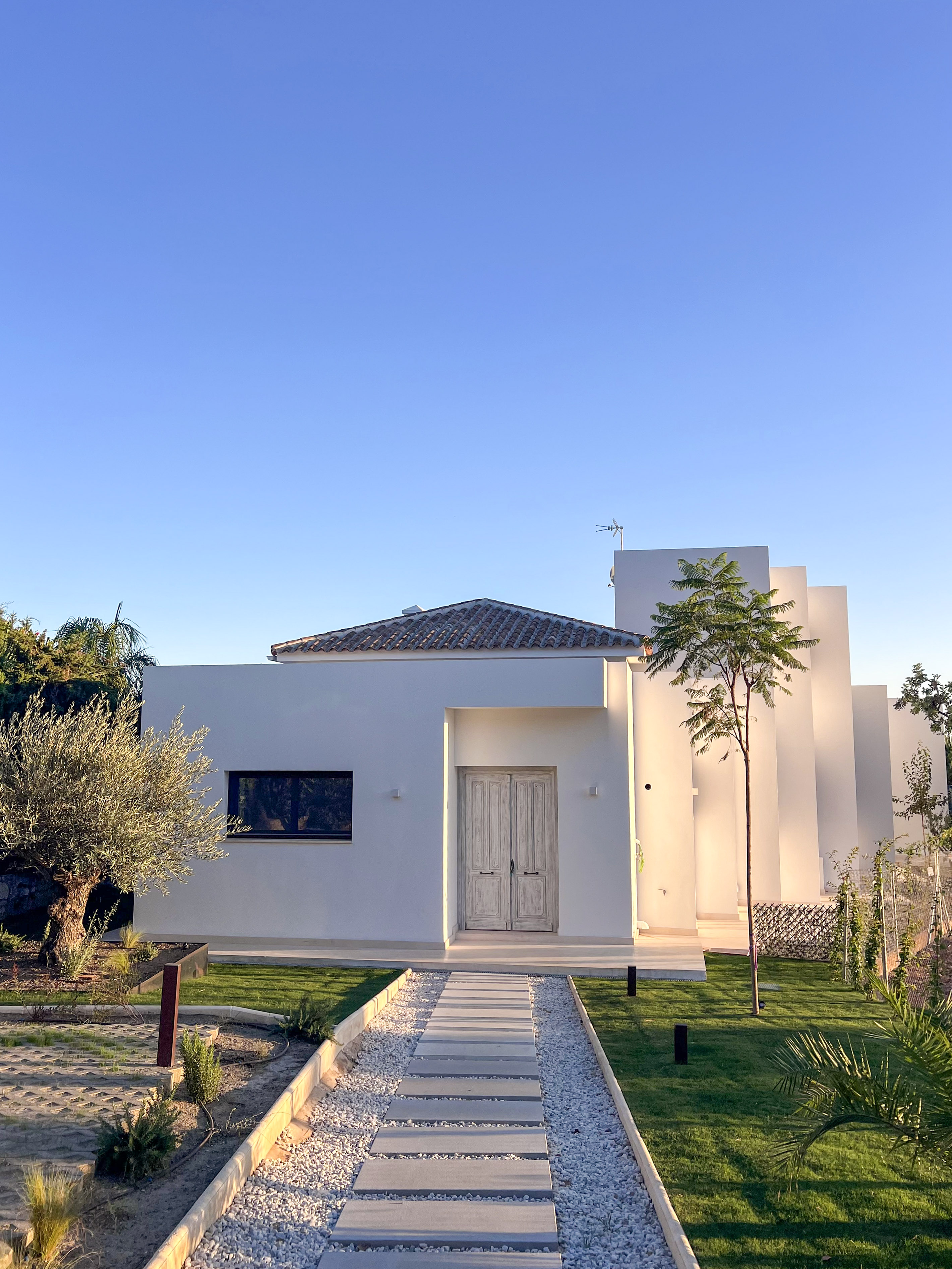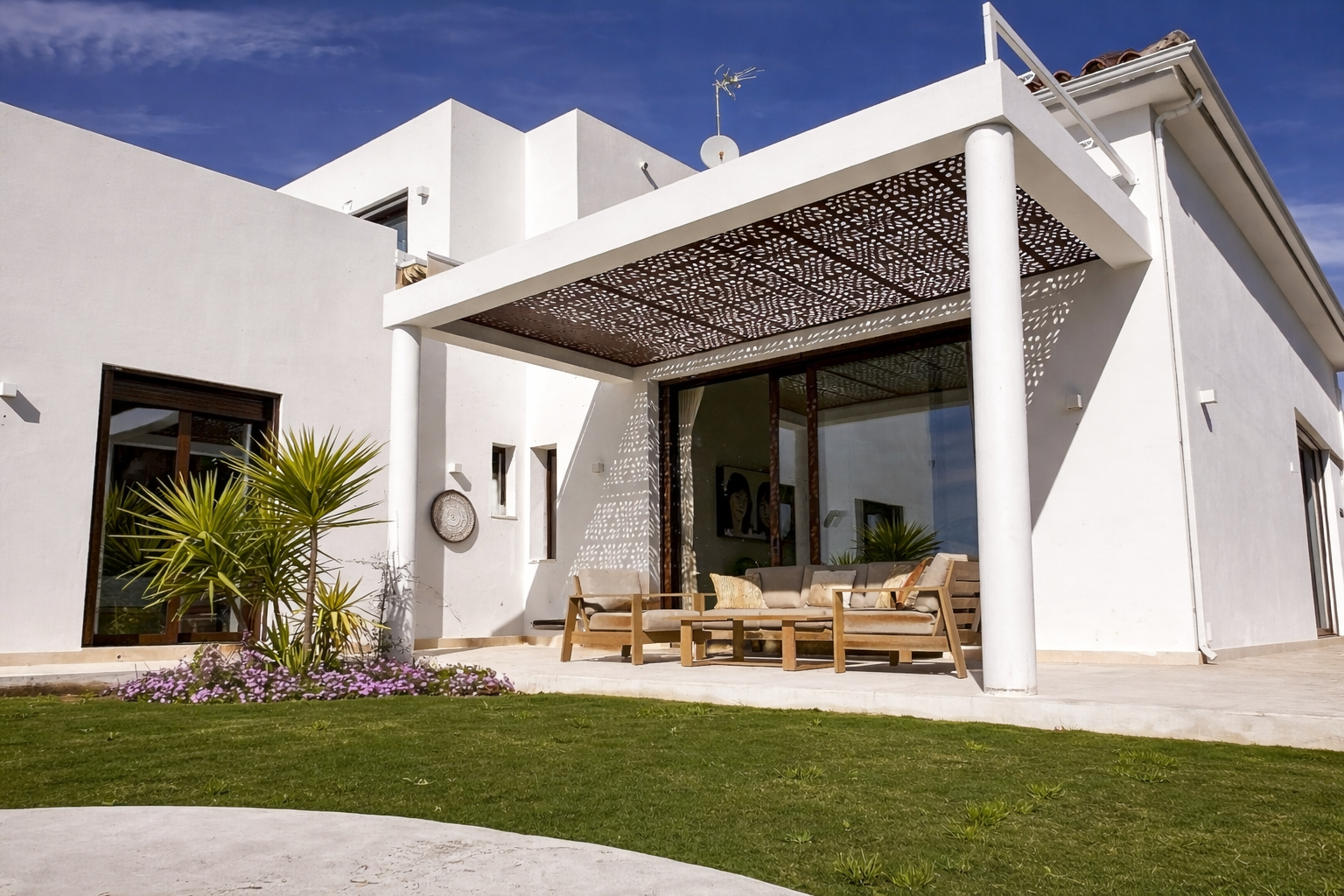 Una construcción de Junco africano original que había en la parcela fue el origen del proyecto, replicando ese gran espacio en el salón, pero con cubierta inclinada de hormigón y teja árabe típica de la zona.