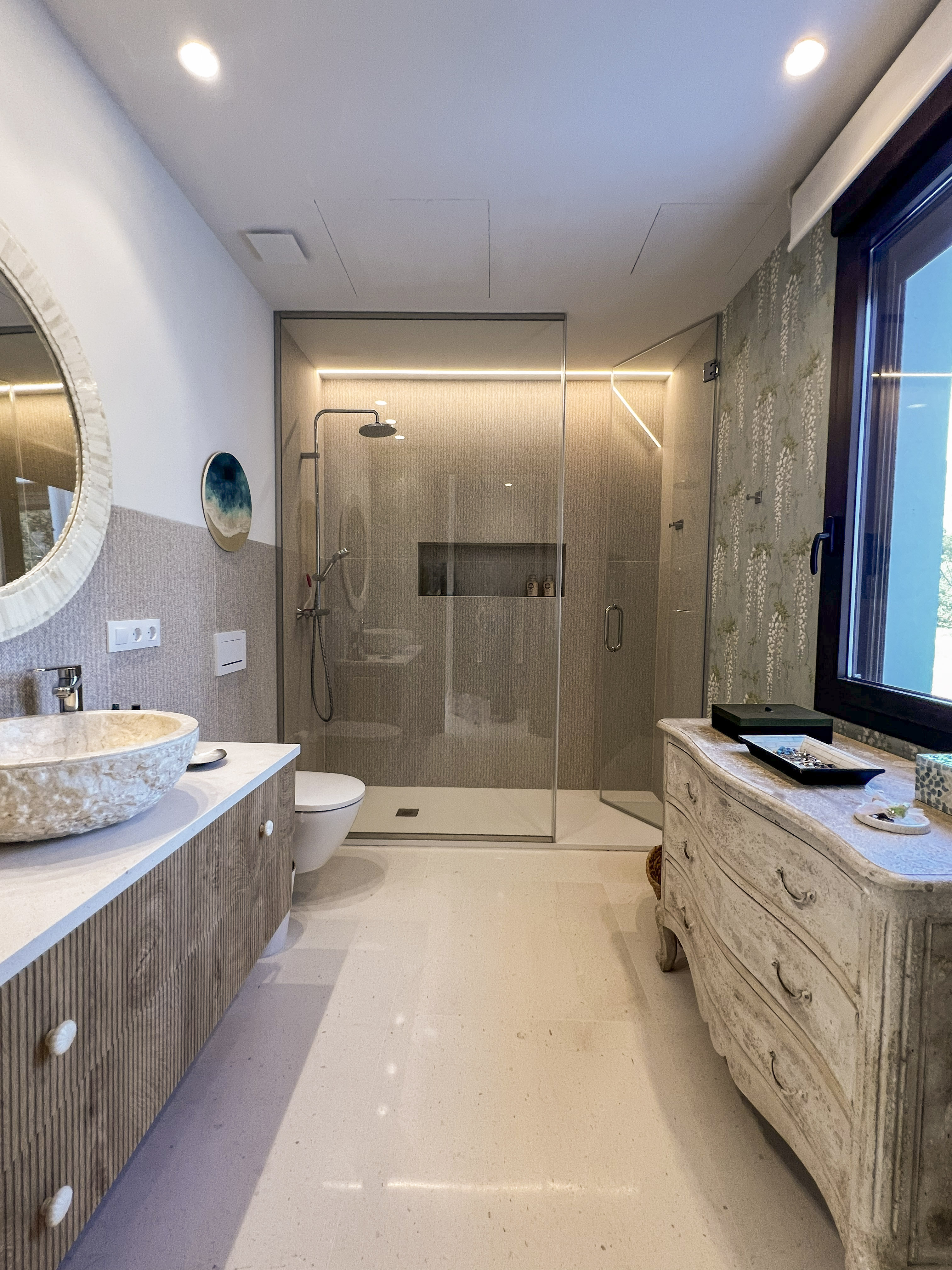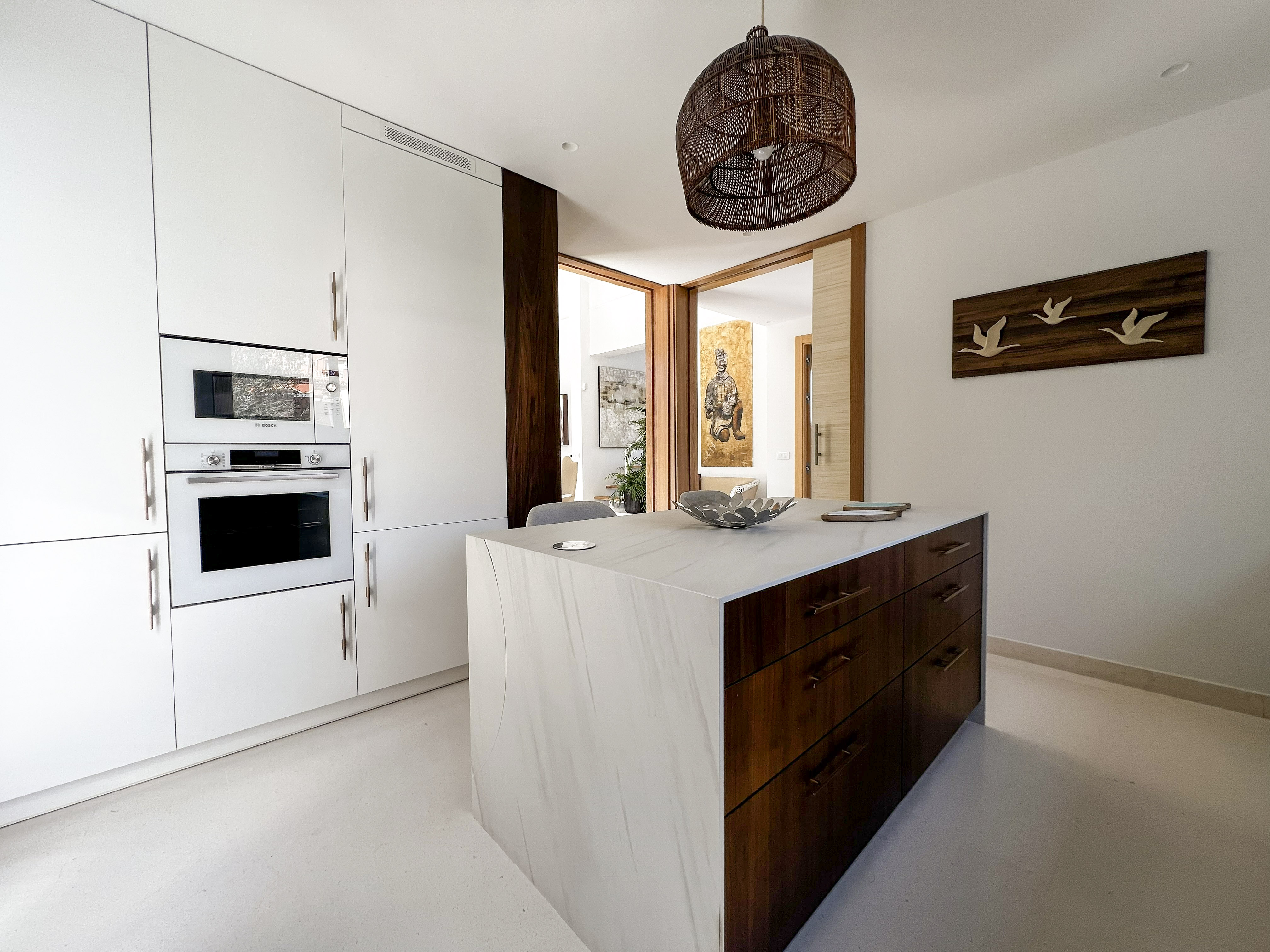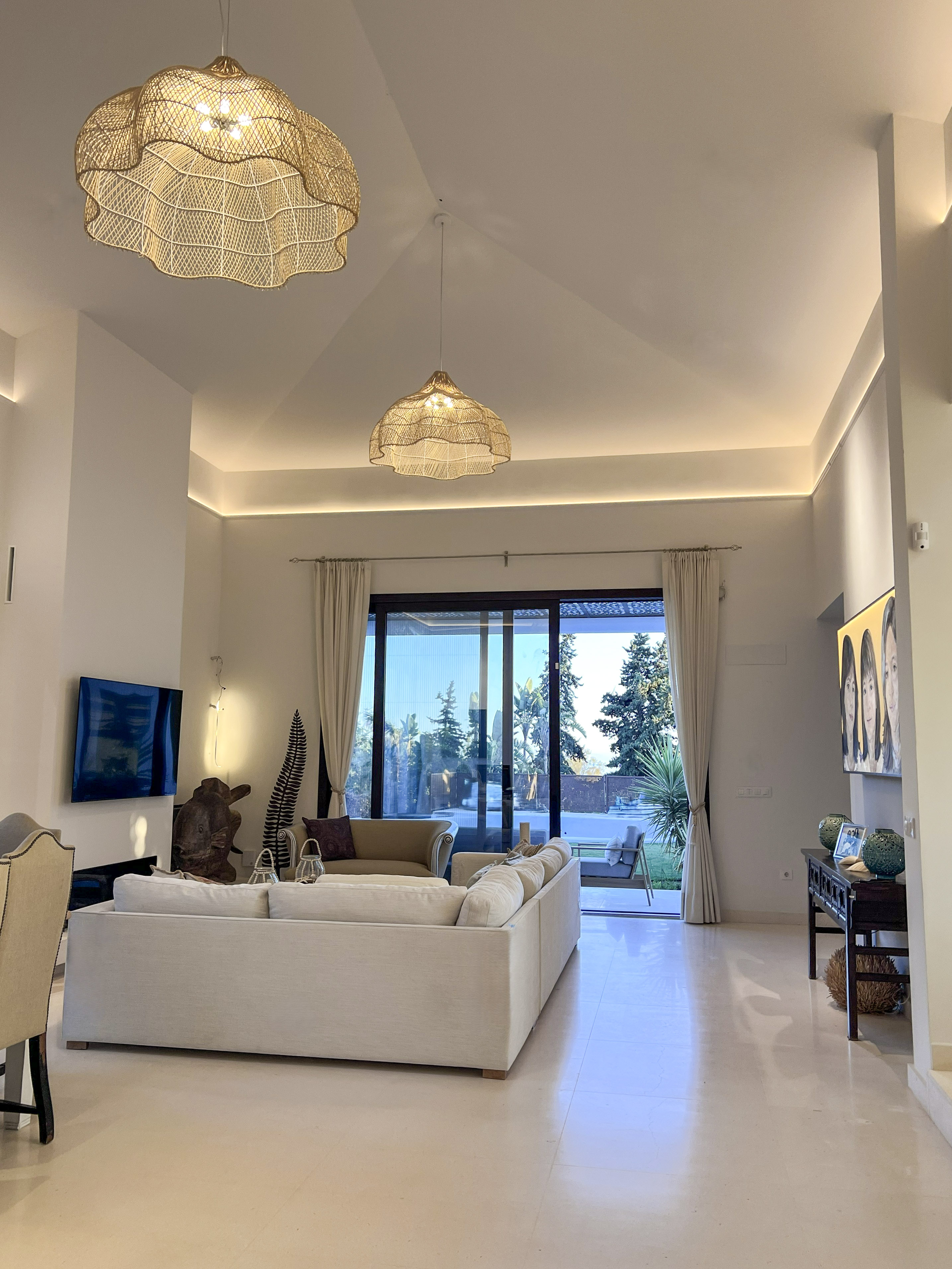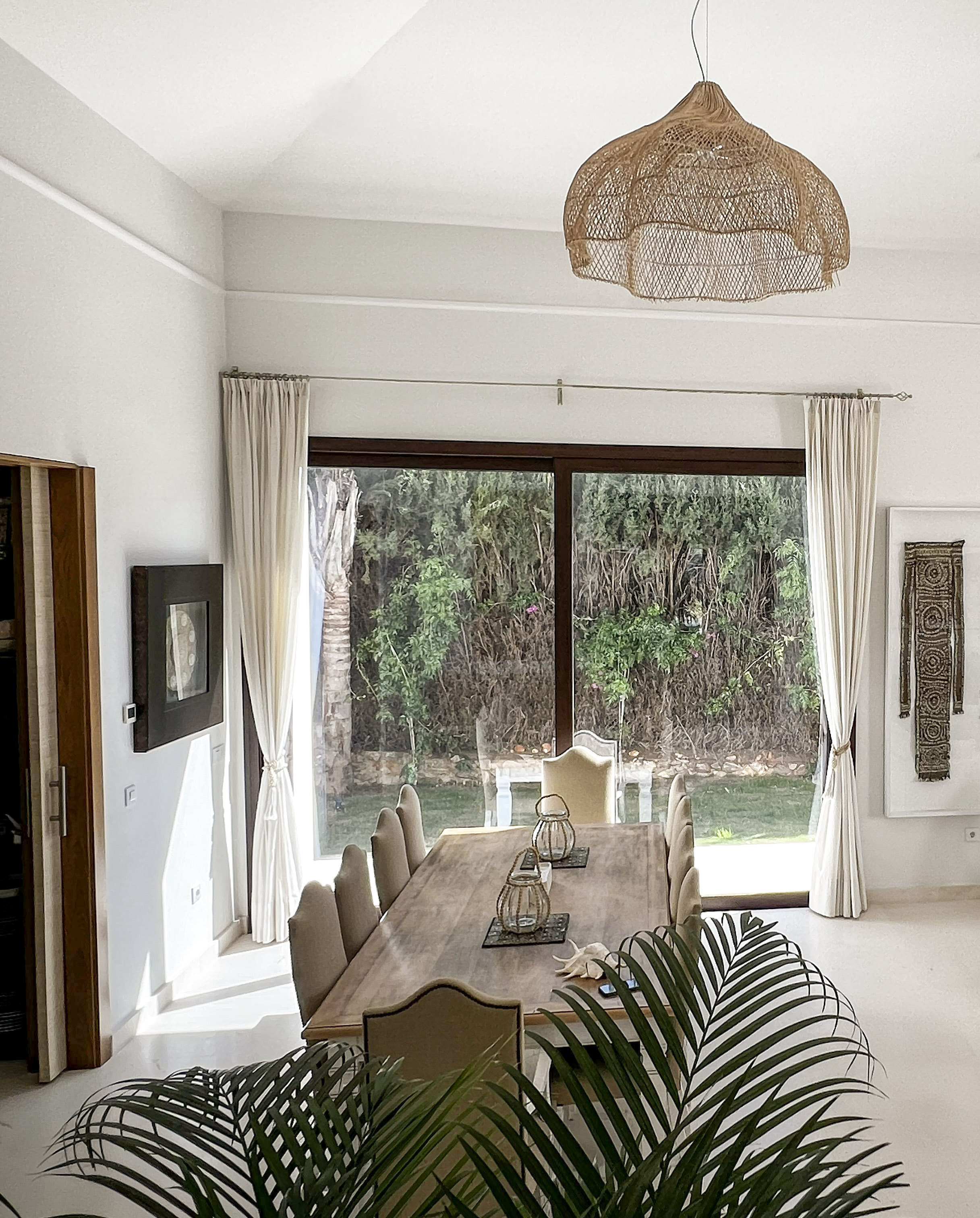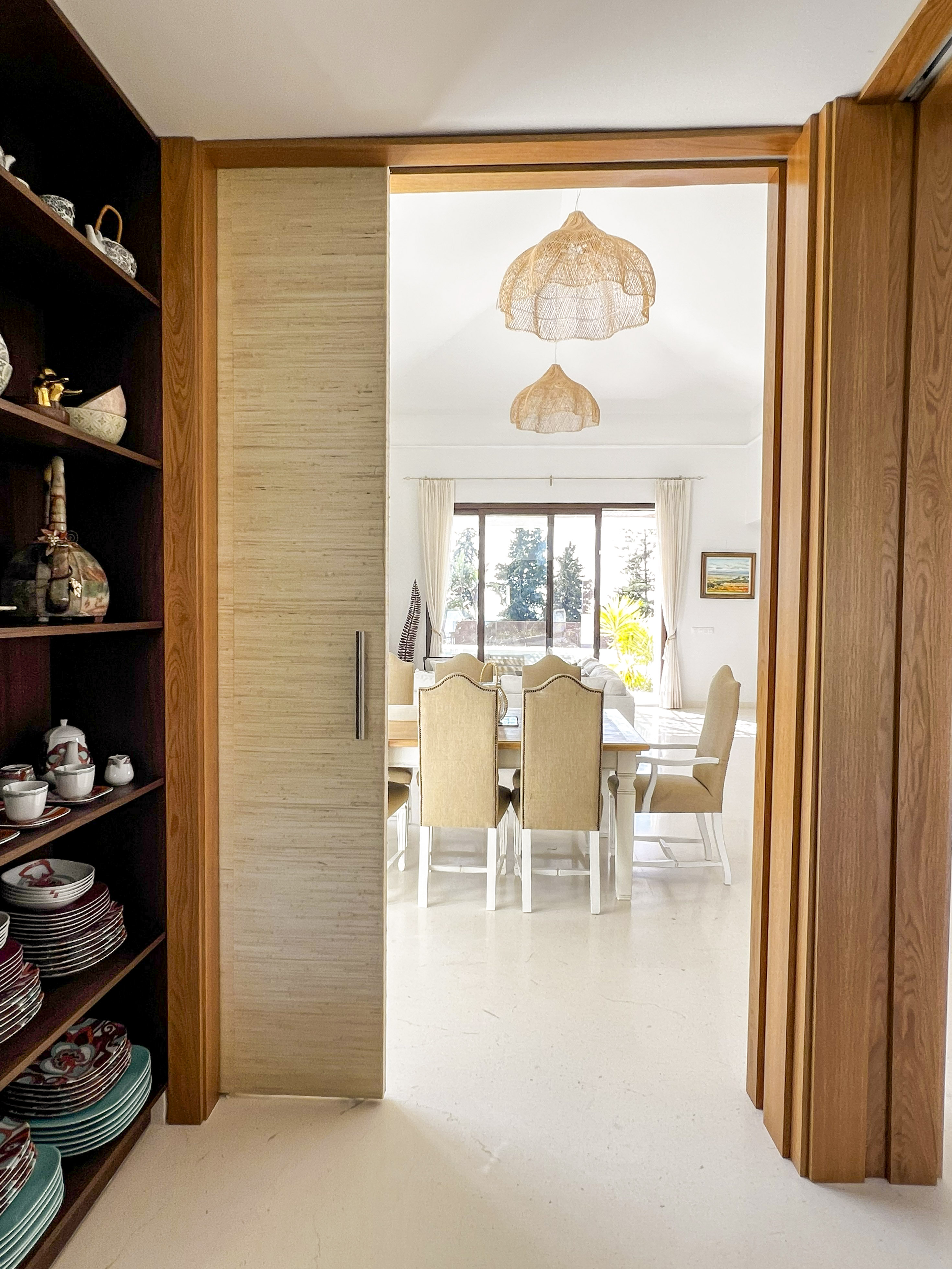 Una construcción de Junco africano original que había en la parcela fue el origen del proyecto, replicando ese gran espacio en el salón, pero con cubierta inclinada de hormigón y teja árabe típica de la zona.