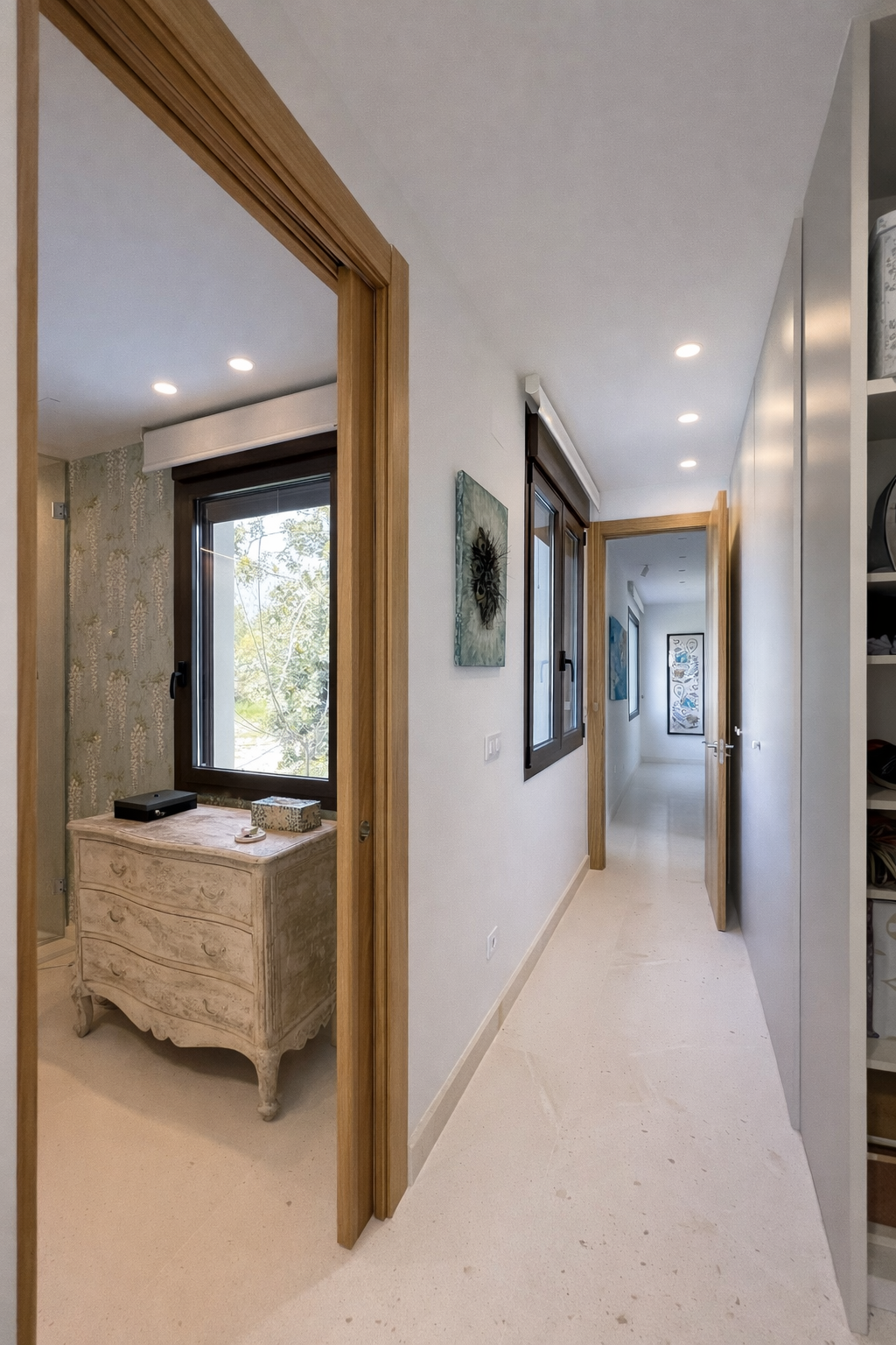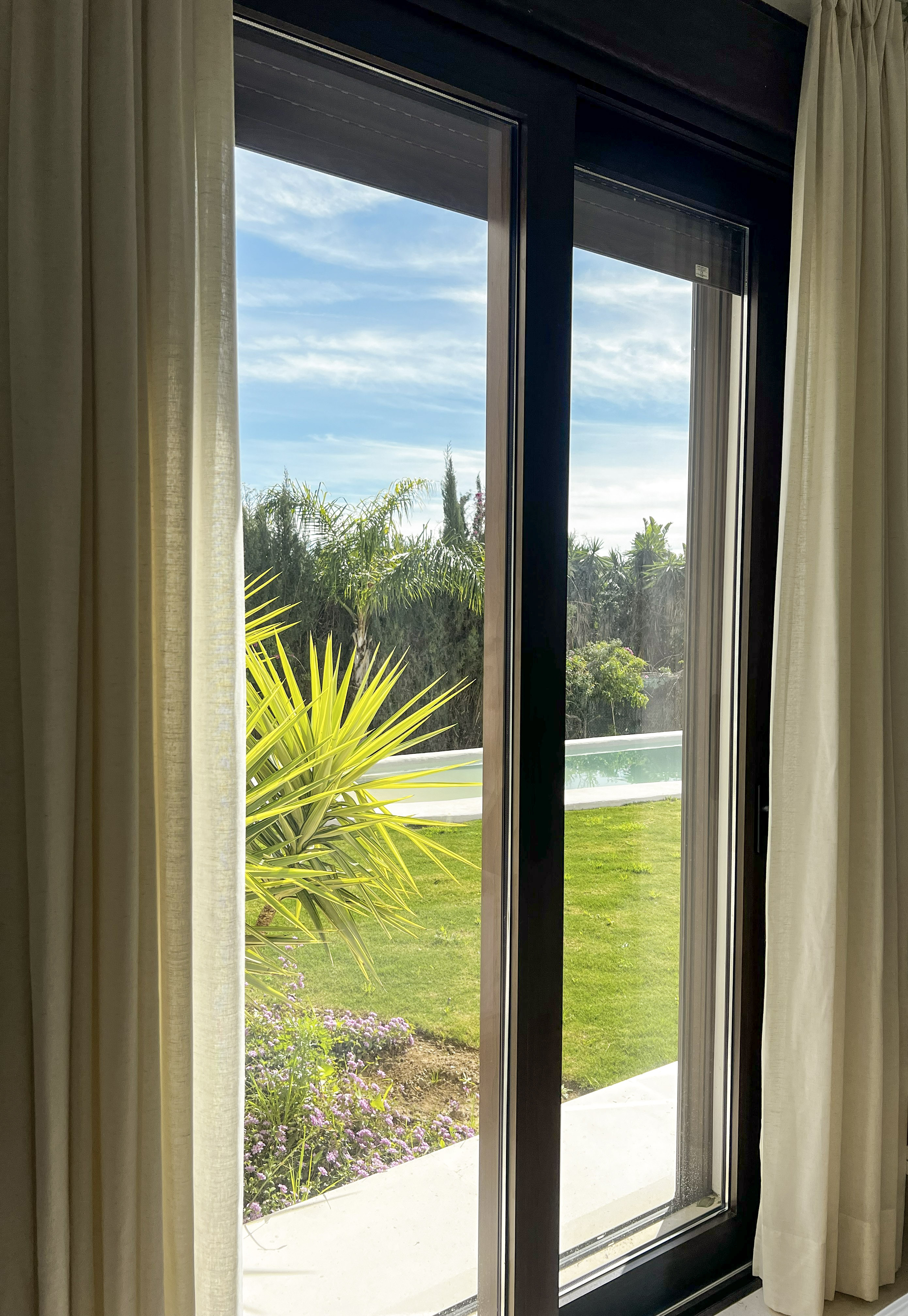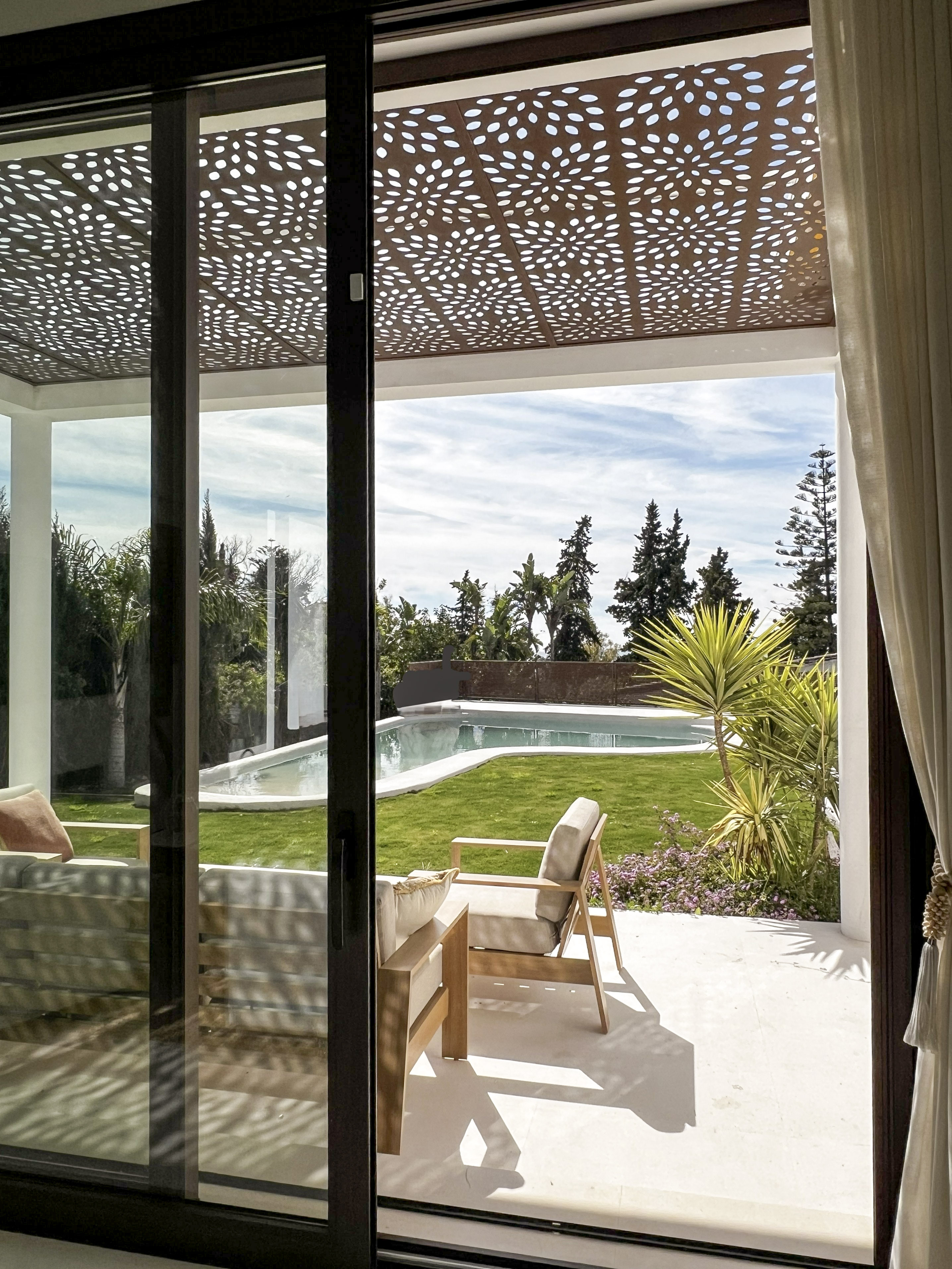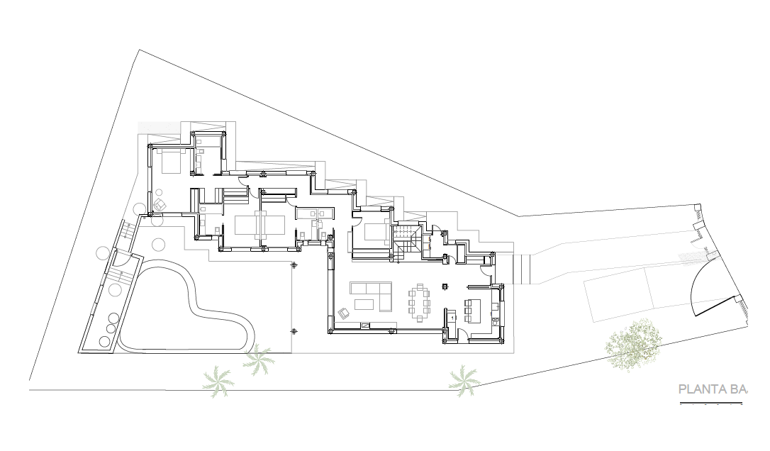 Los dormitorios se desarrollan a lo largo de la parcela y rodeando la piscina, de forma que desde cada estancia se tiene acceso a la misma.